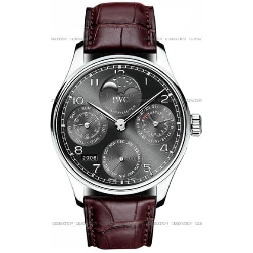 18kt white gold case. Matte brown alligator strap. Ardoise dial with day/date/month/year displays. Moon phase display. Seven-day power reserve displays in small subdial. Convex sapphire crystal. Sapphire crystal caseback. Case diameter 42.3mm. Automatic movement. Water resistant at 30 meters (100 feet). IWC Portuguese Perpetual Calendar 18kt White Gold Brown Mens Watch 5022-18 / 502218